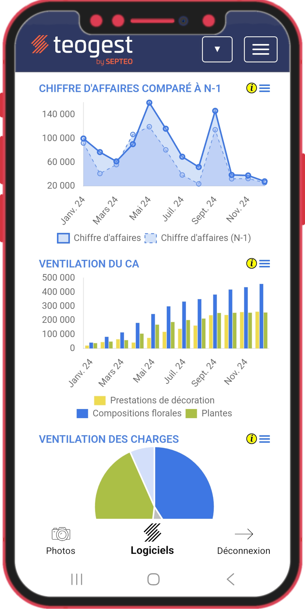 Depuis votre téléphone, vous pourrez aisément visualiser vos tableaux de bord (suivi de trésorerie, du chiffre d'affaires, des dépenses, des budgets, etc.) ou envoyer les photos de vos notes de frais et de vos factures.