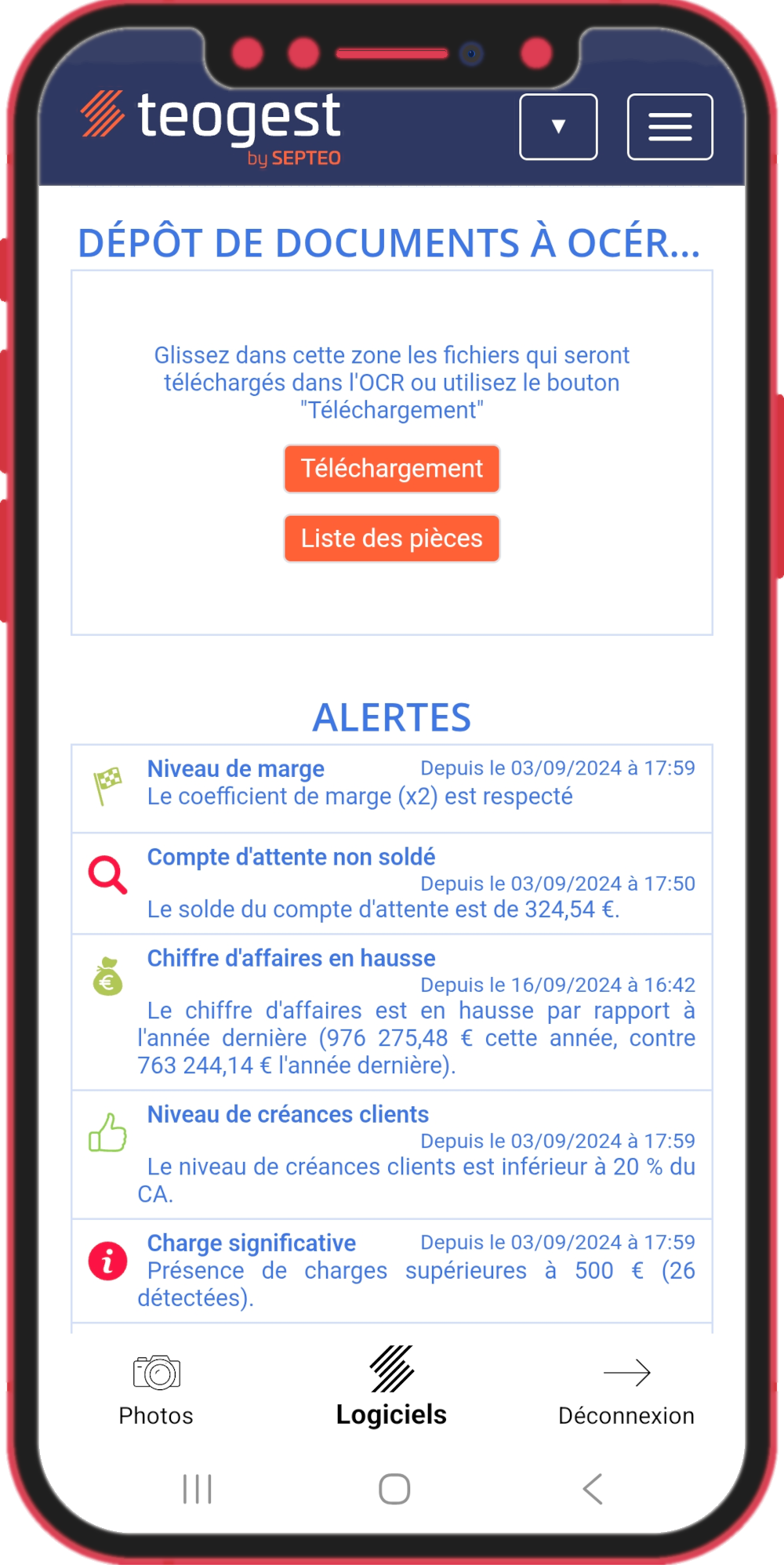Notre application mobile a une double vocation : d'une part, vous permettre de vous connecter facilement à vos logiciels sans avoir à saisir vos identifiants à chaque connexion et, d'autre part, de prendre des photos de notes de frais ou de factures et de les envoyer (de manière unitaire ou groupée) dans le module Teogest OCR pour les intégrer à la comptabilité.