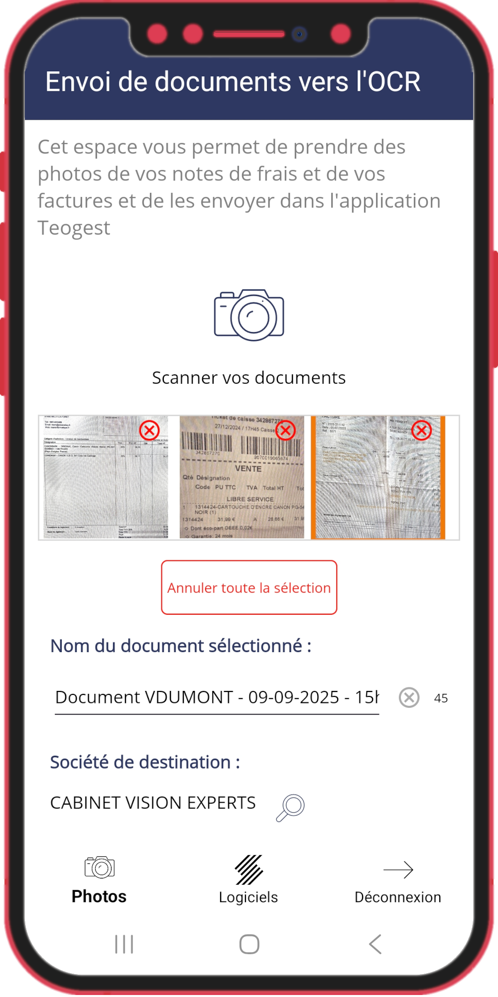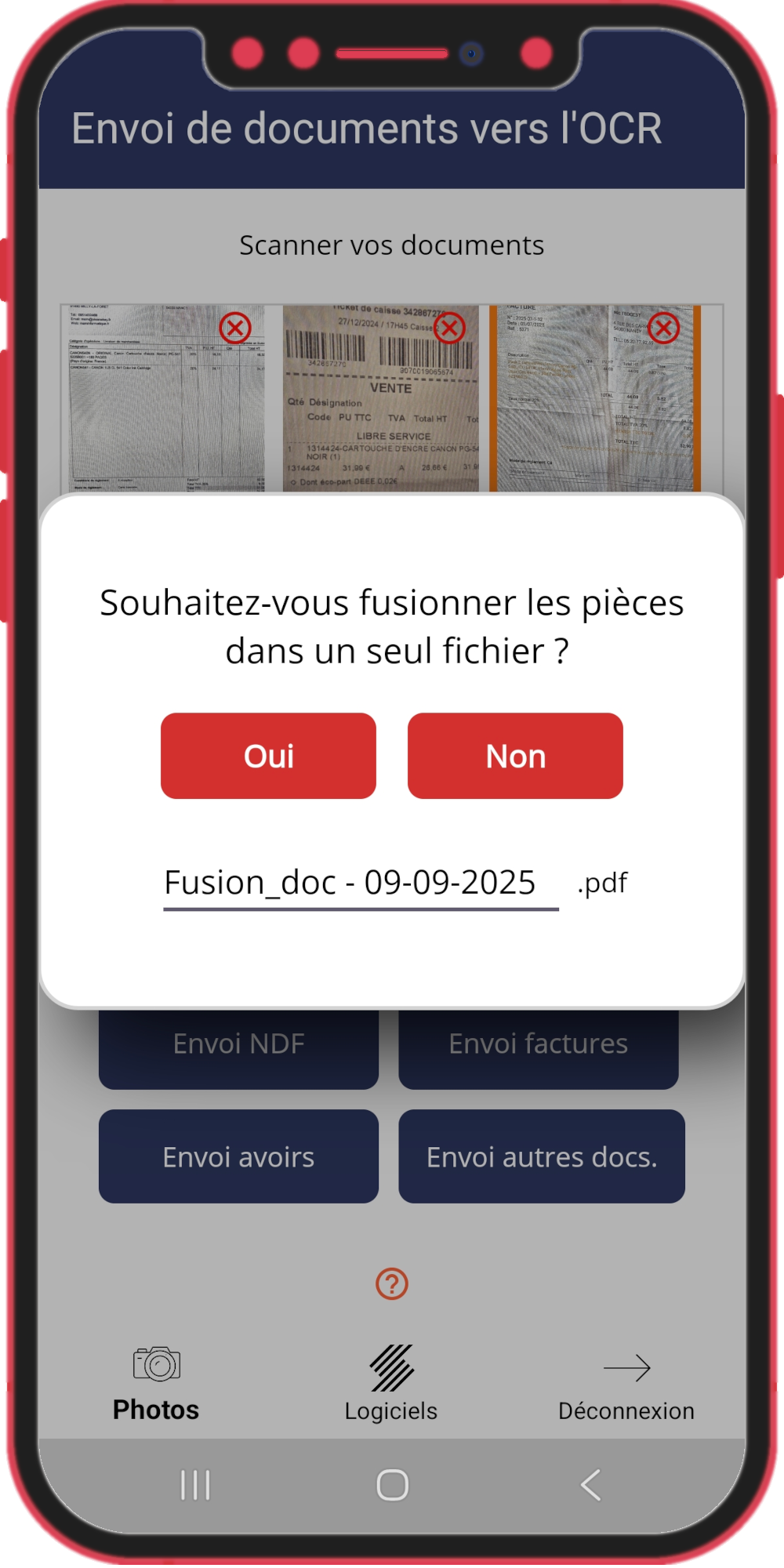 - Prise de photos des documents ou choix depuis les photos existantes