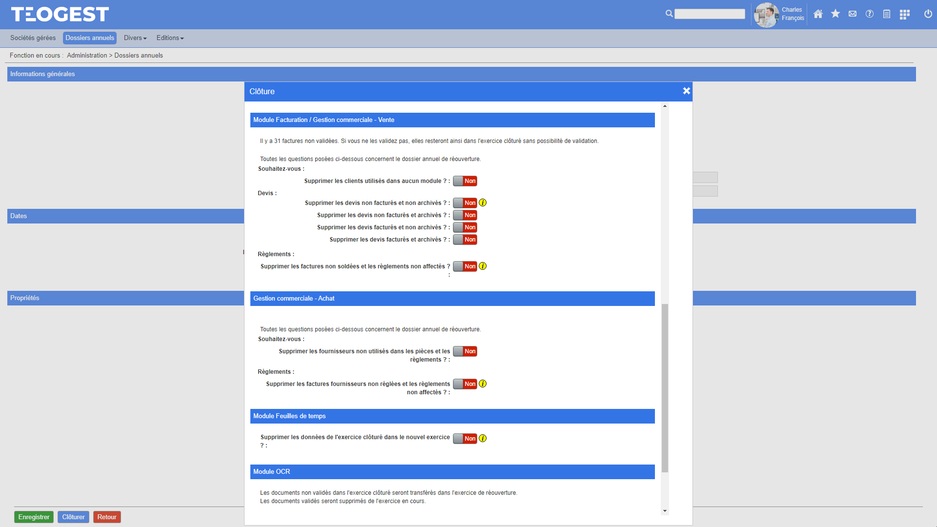 C'est dans le module Administration que se font les clôtures (avec ou sans réouverture) des dossiers annuels.