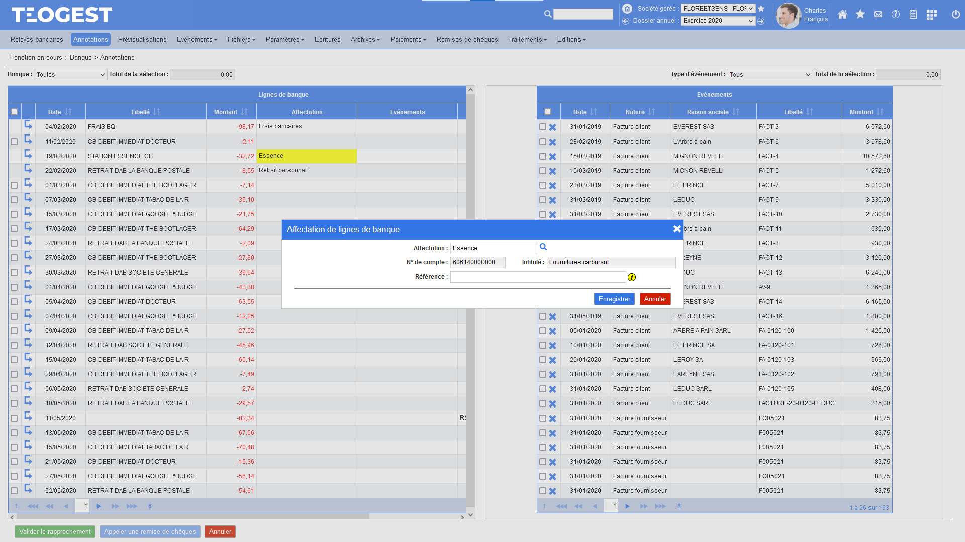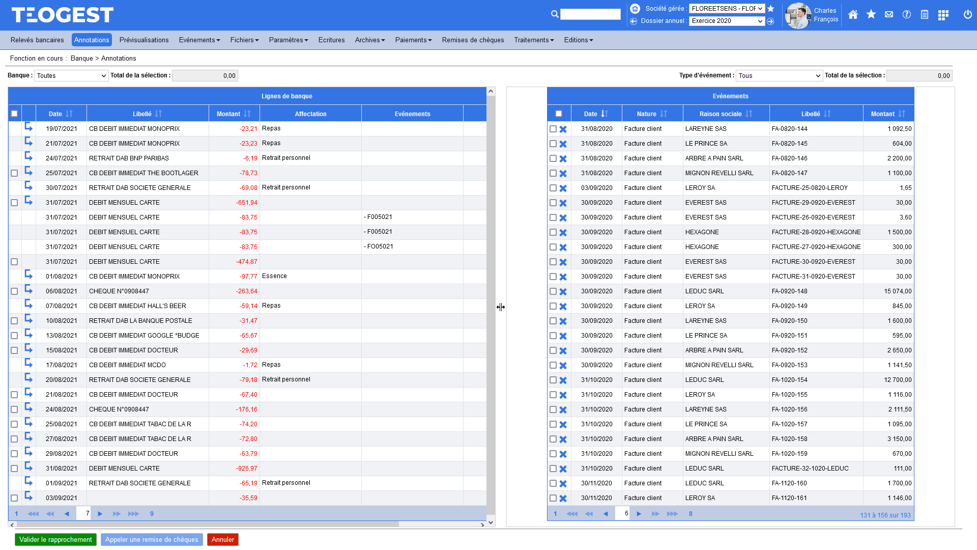 - Annotation des lignes en les rapprochant avec des factures et avoirs clients et fournisseurs émis depuis d'autres modules Teogest