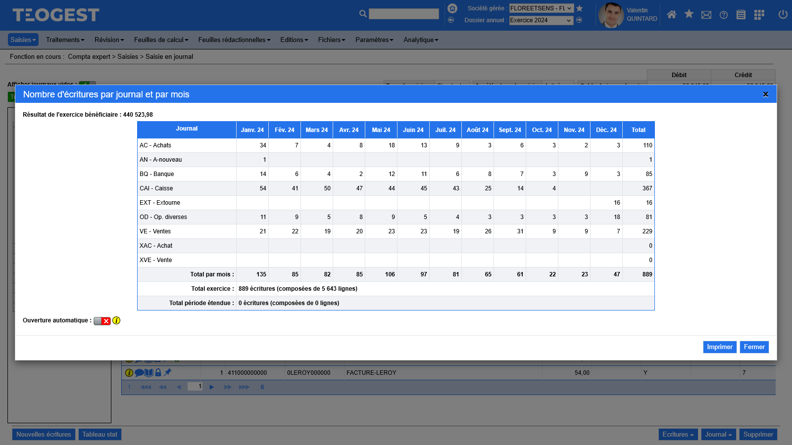 - Nombre d'écritures par journal/mois et total pour l'exercice et la période étendue