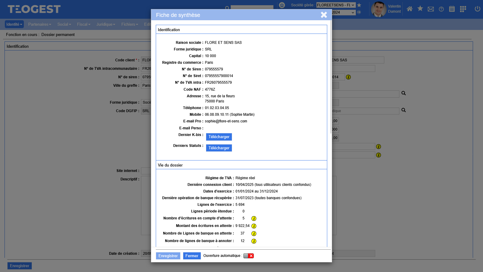 - Fiche signalétique complète en matière fiscale, sociale et juridique avec historisation des modifications effectuées Interfaçage avec le module Teogest Liasse fiscale qui récupère les données nécessaires dans les formulaires Gestion des interlocuteurs et contacts de vos clients Interfacé avec Teogest Annuaire