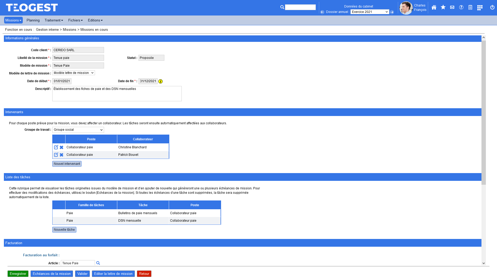 - Paramétrage des informations générales, des intervenants et de la facturation de la mission