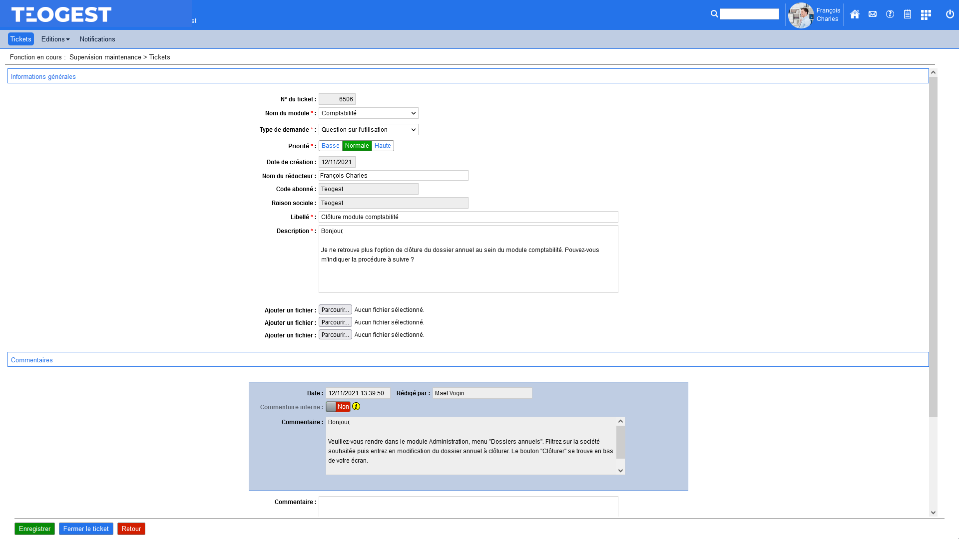 Chaque question est référencée par un numéro de ticket qui restera ouvert tant que le problème ne sera pas résolu et sera fermé par Teogest ou l’utilisateur client dès que la réponse aura été apportée ou le problème réglé.