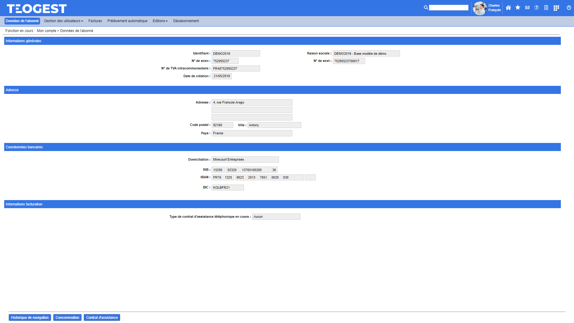 Visualisation des données de facturation de l'abonné Teogest