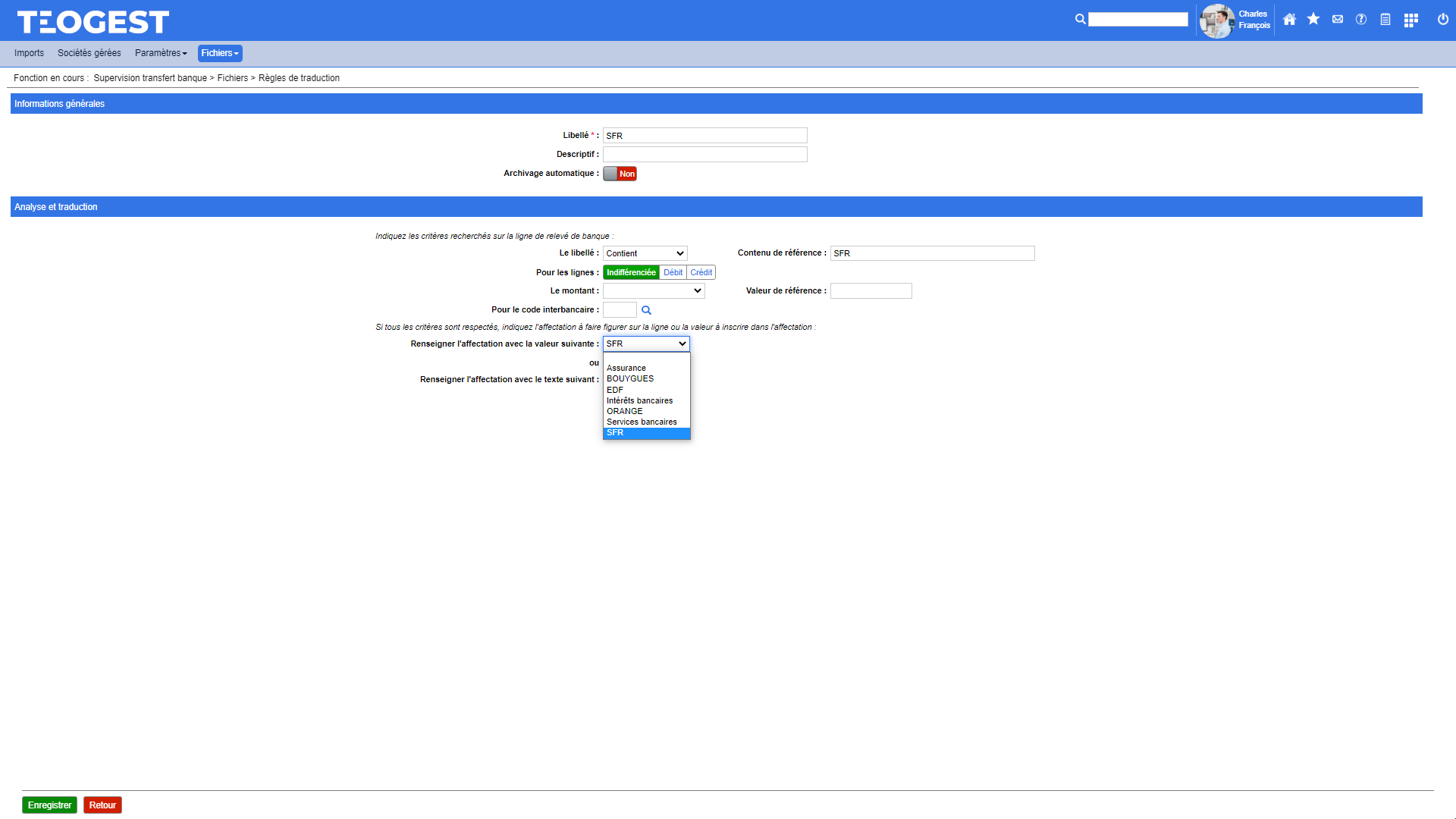 - Traitement global et rapide des fichiers reçus API avec le site jedeclare.com pour la récupération des lignes de relevés Règles de traduction au niveau abonné (cabinet) permettant de les appliquer à tous les clients (des règles de traduction spécifiques à chaque abonné sont ensuite applicables dans Teogest Banque) Exports sélectifs ou globaux