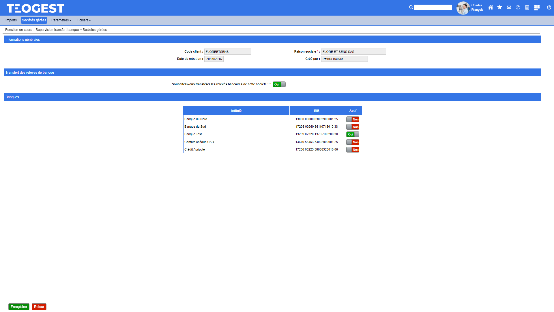 Teogest Supervision transfert banque permet de récupérer les fichiers fournis par les banques (protocole EBICS) et regroupant plusieurs clients du cabinet, d'en extraire les IBAN et de les vérifier afin de répartir et d'exporter les données reconnues vers Teogest Banque, qui les gérera ensuite société par société.